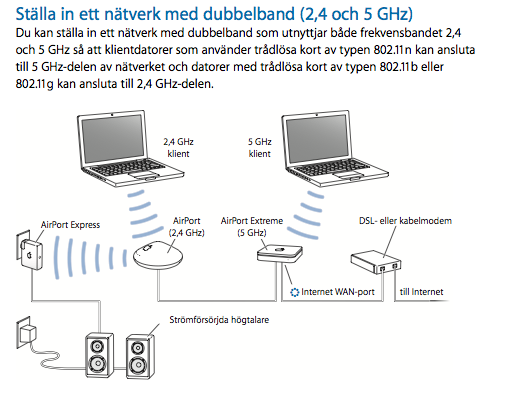 Du kan ställa in ett nätverk med dubbelband som utnyttjar både frekvensbandet 2,4 och 5 GHz så att klientdatorer som använder trådlösa kort av typen 802.11n kan ansluta till 5 GHz-delen av nätverket och datorer med trådlösa kort av typen 802.11b eller 802.11g kan ansluta till 2,4 GHz-delen.