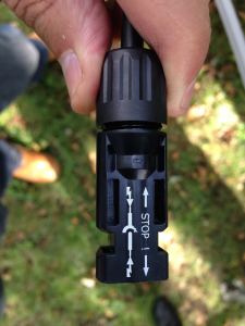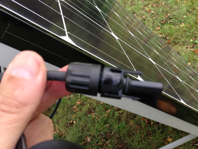 Då har den första panelen kommit. Enkel att koppla in, 1 plus- och 1 minus-kontakt. Lite daxljus och ögonblickligen kommer ström i kablarna.