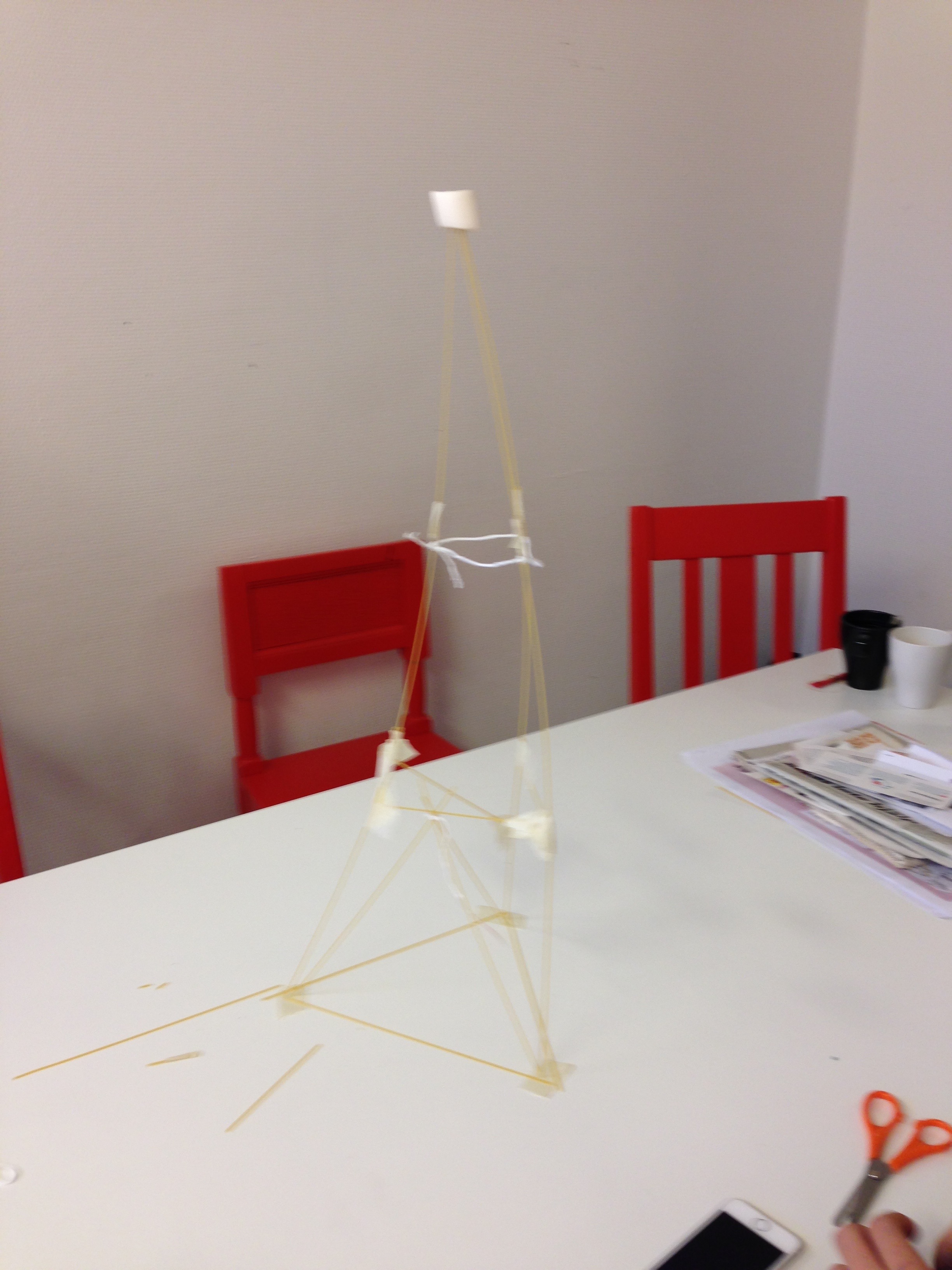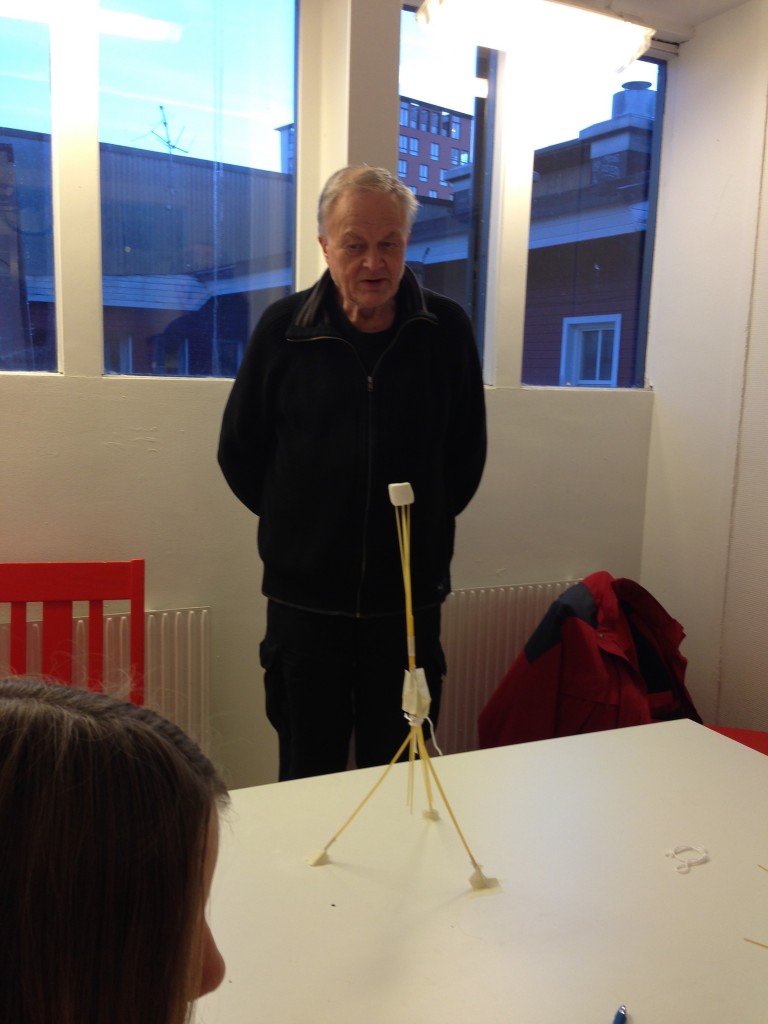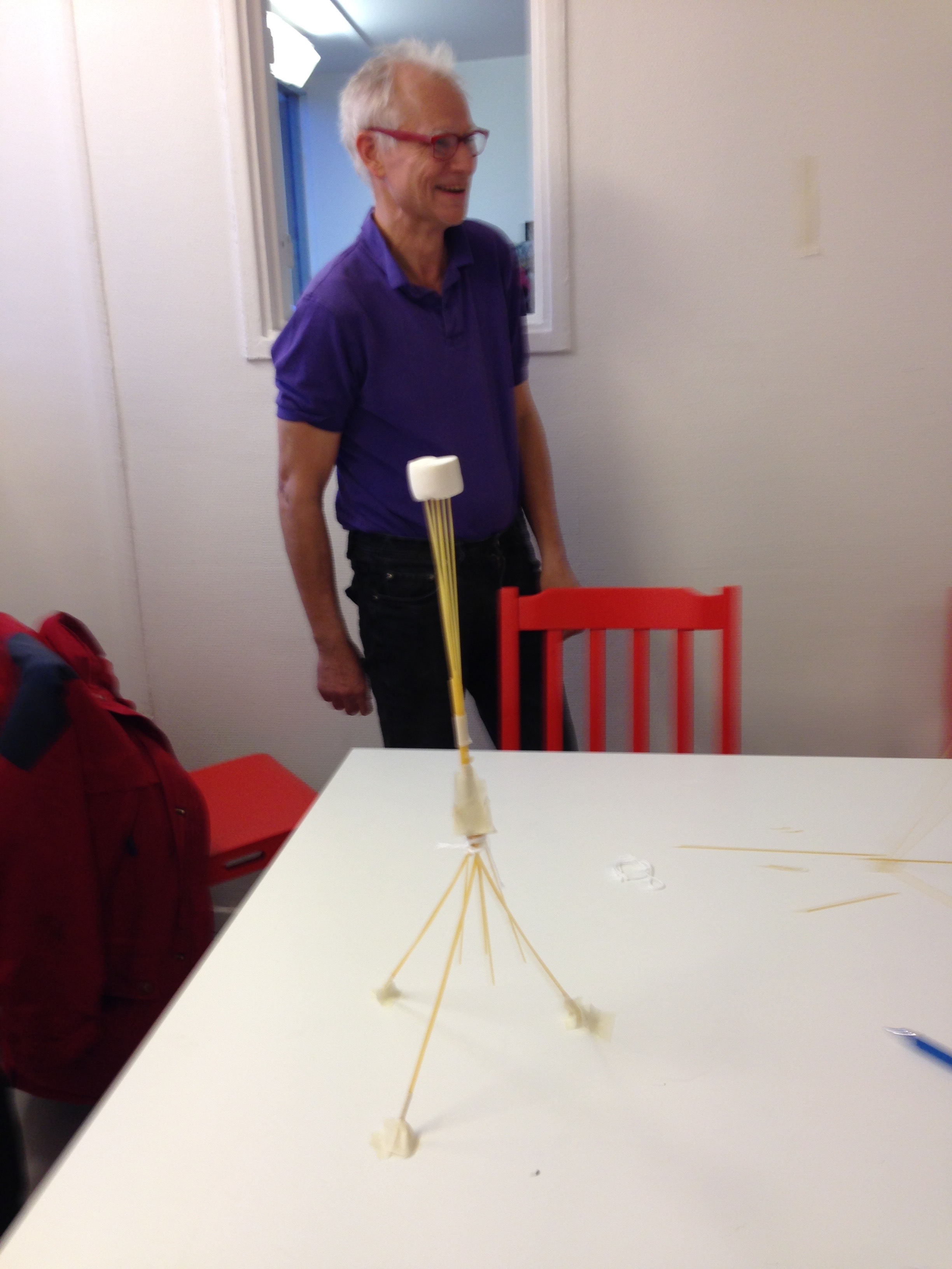 Till vår workshop startade vi med något som kallas marshmallow utmaningen. På 18 minuter ska man bygga en konstruktion och placera en marshmallow på toppen. Den konstruktion som är högst och står kvar när man släpper händerna har vunnit. Det är inte så lätt och käre Peter trodde att uppgiften var omöjlig. Men det visade sig att det gick. Vi delade in oss i 3 grupper i åldrar från 10-70 år