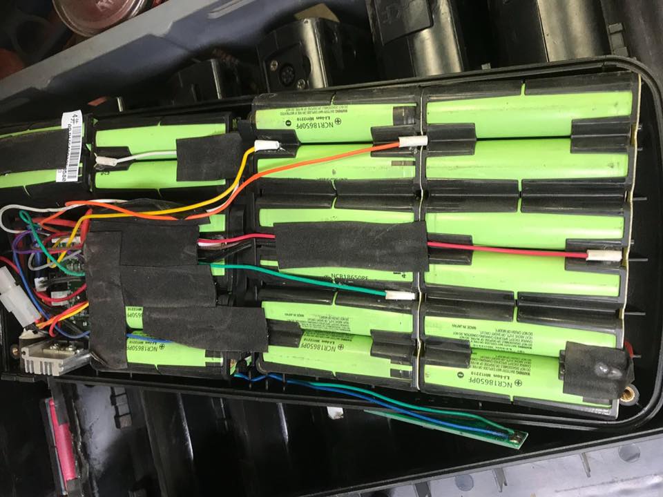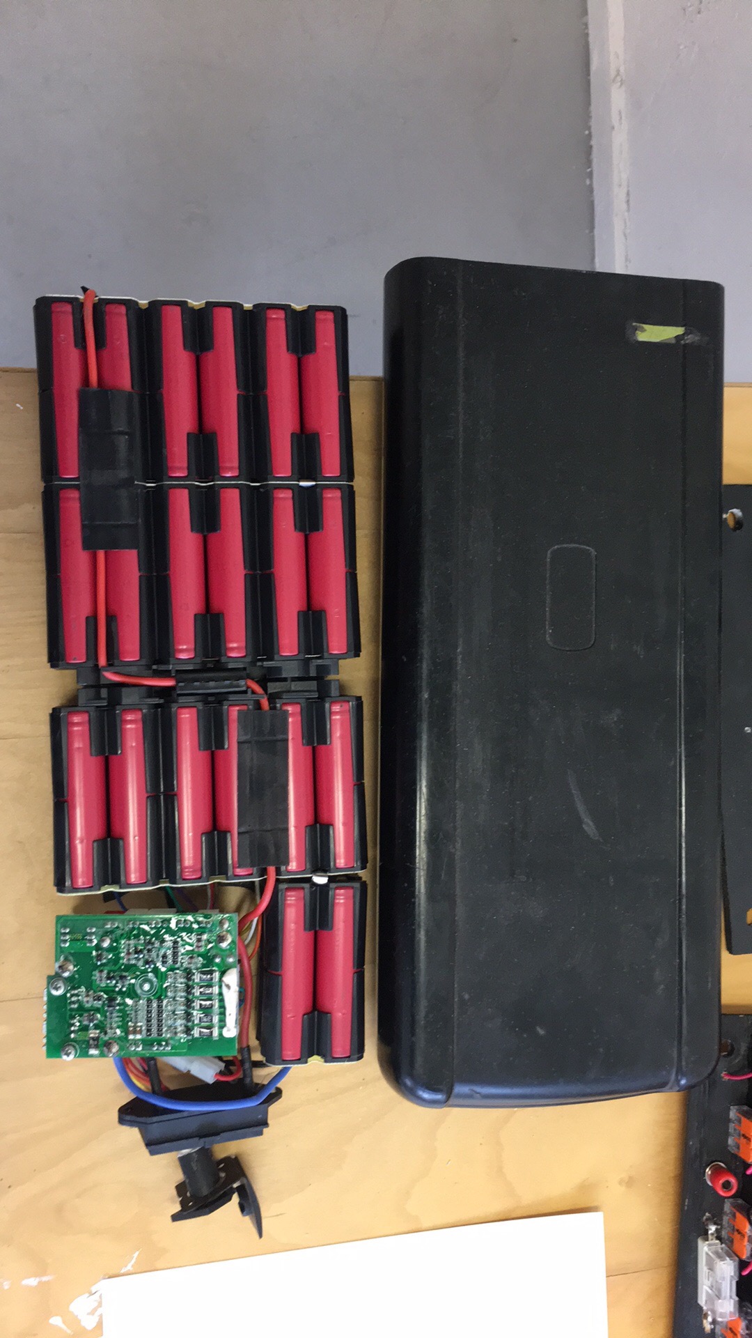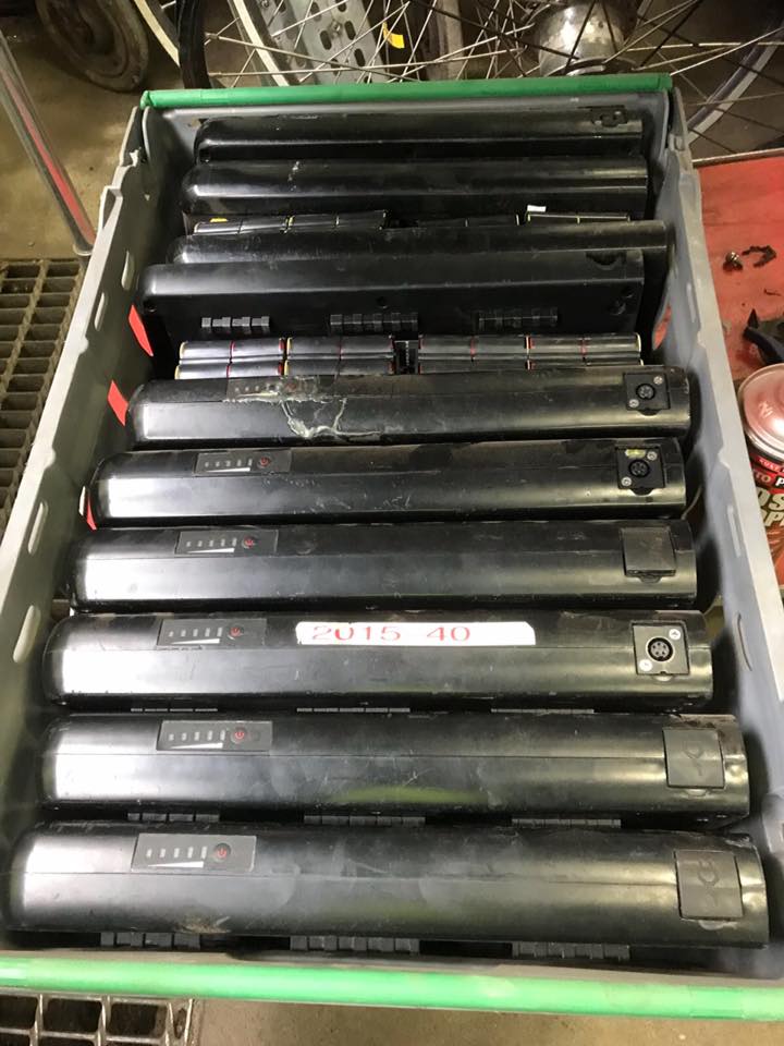 Batterier från Kommunen som vi fått tillgång till för att testa om de går att återanvända eller förlänga livslängden på. Ett förslag att utforska är möjligheten att använda dessa i vår laddstation, och ladda med lägre spänning. Första steget är dock att validera att de går att använda i vår laddare.