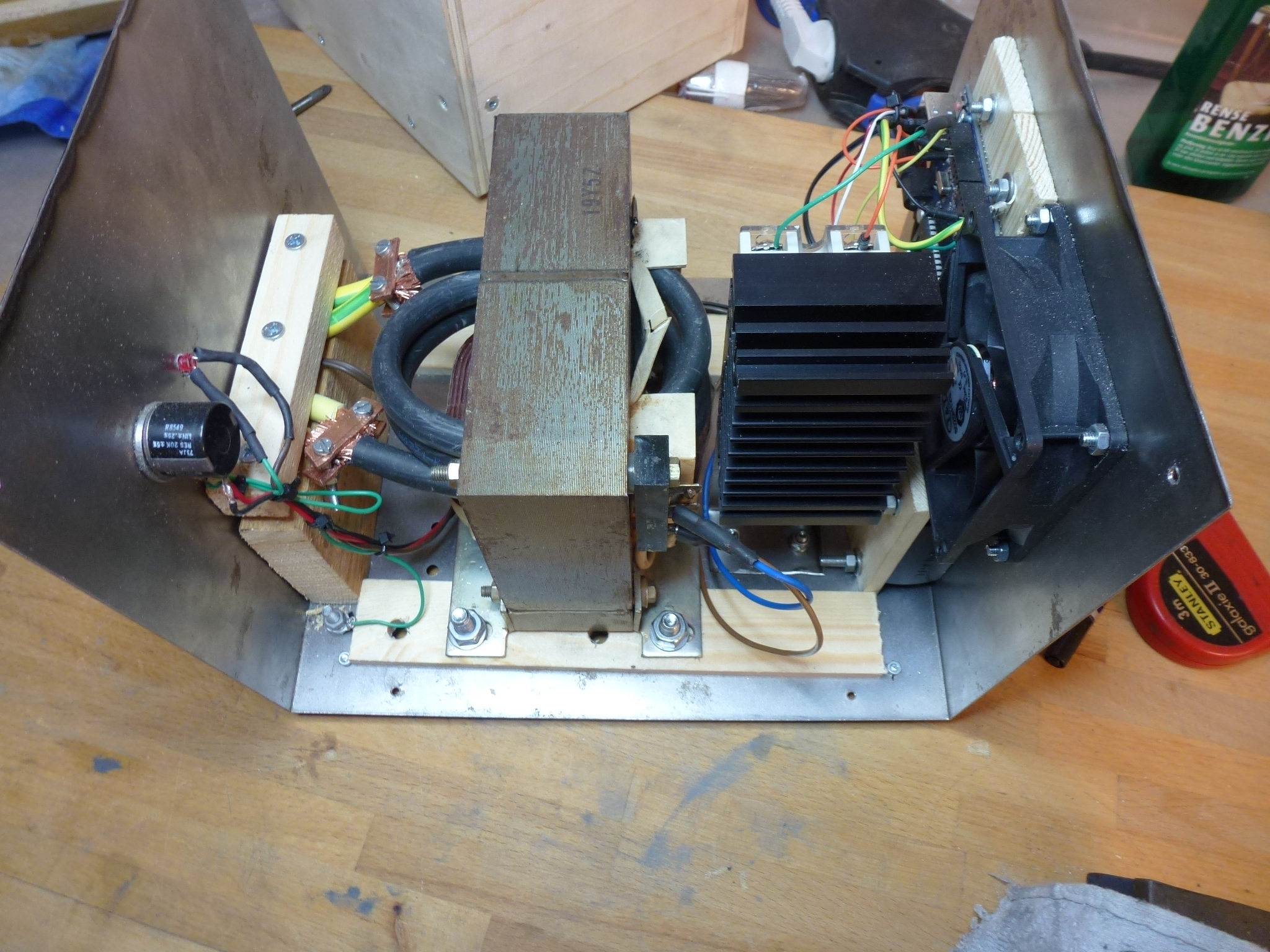 see attached some pictures of the spot welder. I found that a long cable (like on the picture) causes too much power loss, so I made it into a very short cable instead. The inside is an old microwave oven transformer with the secondary coil consisting of only two windings, powered by a solid state relay (AC, zero-cross switching, 40A max). When you push the small push button on the handle, the transformer is engaged very shortly, and a high current will flow at a low voltage (about 4 Volt).