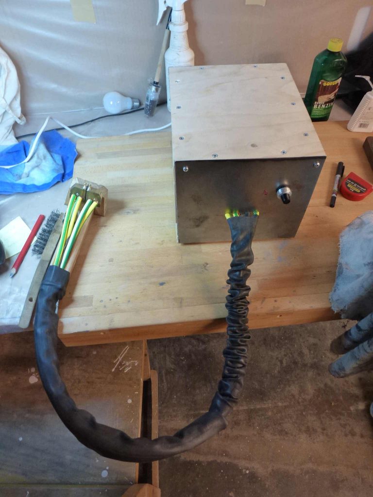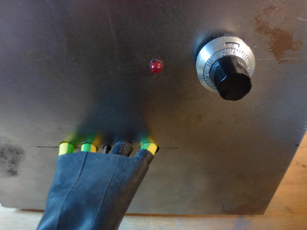 There will be two successive pulses: one to ‘clean up’ and preheat the metals, and one to do the actual melting of the metals. The duration of the main pulse can be set by a potmeter.