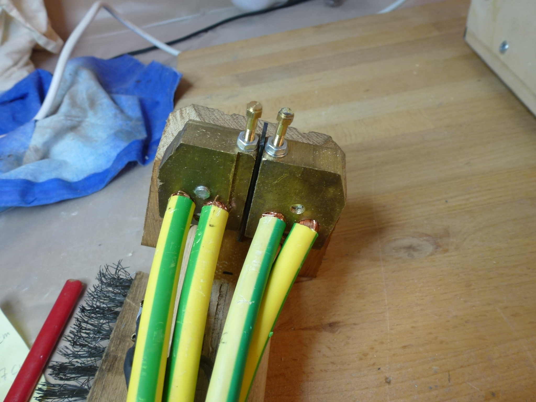 On the pictures you can see two brass bolts I used for the contacts, but they did not seem to do the work. I then changed to copper electrodes, and they seem to work better.