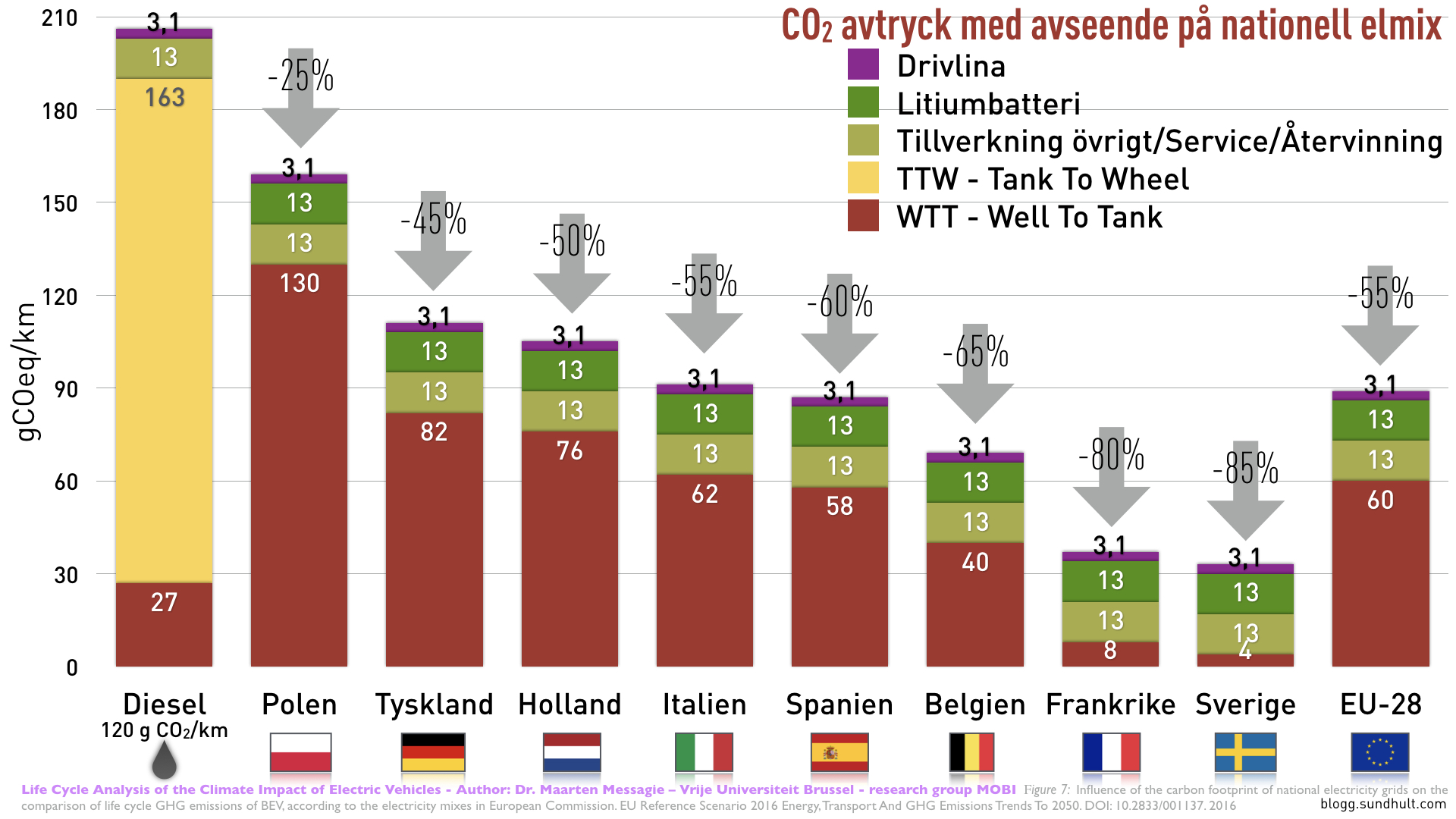På universitetet i Bryssel har det gjorts en livscykelanalys på klimatpåverkan för elbilen, beroende på vilken nationell elmix som används. Den jämför en dieselbil som släpper ut 120 gCO2/km med allt från polsk elproduktion, med stor andel kol, till svensk med mycket vattenkraft och kärnkraft.