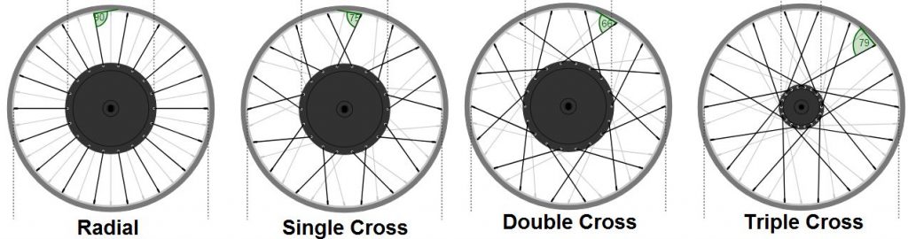 Ekrar är korsade så att de spända ekrarna har en tangentiell kraftkomponent som kan överföra vridmoment mellan navflänsen och fälgen. För vanliga cykelnav kan ekrarna vanligtvis korsa varandra 3 gånger för att uppnå tillräcklig vinkel. På en navmotor är flänsen så stor att ett enda kors normalt ger en jämnare vinkel än trippelkors i ett vanligt nav. Vi har sett många gånger där folk har föreslagit att navmotorerna också ska vara laced 2 eller 3 cross för att vara tillräckligt ”starka”, och det här gör ingen mening. En dubbelkorsspets kan arbeta med hubmotorer med små diametrar med stora fälgar, men annars är det en extra utmaning för spetsar och resulterar i talade bröstvårtor som kommer genom fälgen vid branta vinklar.